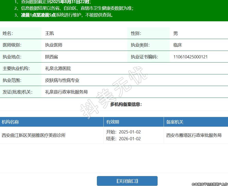 姓名:王凱性別:男醫(yī)師級(jí)別:執(zhí)業(yè)醫(yī)師執(zhí)業(yè)類別:臨床執(zhí)業(yè)地點(diǎn):陜西省執(zhí)業(yè)證書(shū)編碼:110610425000121主要執(zhí)業(yè)機(jī)構(gòu):禮泉北港醫(yī)院執(zhí)業(yè)范圍:皮膚病與性病專業(yè)發(fā)證(批準(zhǔn))機(jī)關(guān):禮泉縣行政審批服務(wù)局多機(jī)構(gòu)備案信息:機(jī)構(gòu)名稱 有效期 備案機(jī)關(guān) 西安曲江新區(qū)芙麗雅醫(yī)療美容診所 開(kāi)始:2025-01-02結(jié)束:2026-01-02西安市雁塔區(qū)行政審批服務(wù)局 -