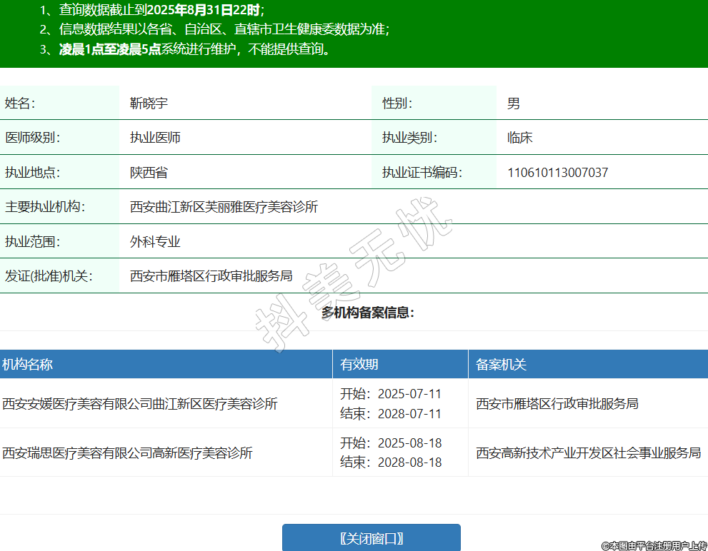 姓名:靳曉宇性別:男醫(yī)師級別:執(zhí)業(yè)醫(yī)師執(zhí)業(yè)類別:臨床執(zhí)業(yè)地點:陜西省執(zhí)業(yè)證書編碼:110610113007037主要執(zhí)業(yè)機構:西安曲江新區(qū)芙麗雅醫(yī)療美容診所執(zhí)業(yè)范圍:外科專業(yè)發(fā)證(批準)機關:西安市雁塔區(qū)行政審批服務局多機構備案信息:機構名稱 有效期 備案機關 西安安媛醫(yī)療美容有限公司曲江新區(qū)醫(yī)療美容診所 開始:2025-07-11結束:2028-07-11西安市雁塔區(qū)行政審批服務局 西安瑞思醫(yī)療美容有限公司高新醫(yī)療美容診所 開始:2025-08-18結束:2028-08-18西安高新技術產(chǎn)業(yè)開發(fā)區(qū)社會事業(yè)服務局 -
