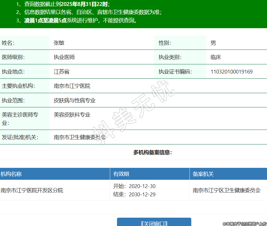 姓名:張敏性別:男醫(yī)師級(jí)別:執(zhí)業(yè)醫(yī)師執(zhí)業(yè)類別:臨床執(zhí)業(yè)地點(diǎn):江蘇省執(zhí)業(yè)證書編碼:110320100019169主要執(zhí)業(yè)機(jī)構(gòu):南京市江寧醫(yī)院執(zhí)業(yè)范圍:皮膚病與性病專業(yè)美容主診醫(yī)師專業(yè):美容皮膚科專業(yè)發(fā)證(批準(zhǔn))機(jī)關(guān):南京市衛(wèi)生健康委員會(huì)多機(jī)構(gòu)備案信息:機(jī)構(gòu)名稱 有效期 備案機(jī)關(guān) 南京市江寧醫(yī)院開發(fā)區(qū)分院 開始:2020-12-30結(jié)束:2030-12-29南京市江寧區(qū)衛(wèi)生健康委員會(huì) -