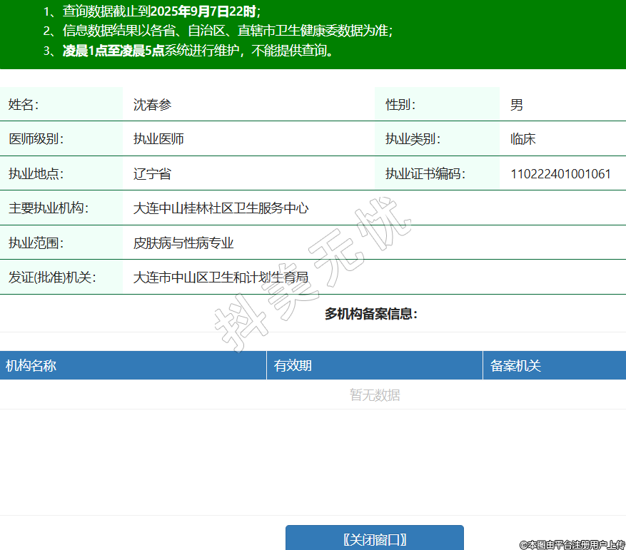 姓名:沈春參性別:男醫(yī)師級別:執(zhí)業(yè)醫(yī)師執(zhí)業(yè)類別:臨床執(zhí)業(yè)地點:遼寧省執(zhí)業(yè)證書編碼:110222401001061主要執(zhí)業(yè)機構(gòu):大連中山桂林社區(qū)衛(wèi)生服務(wù)中心執(zhí)業(yè)范圍:皮膚病與性病專業(yè)發(fā)證(批準)機關(guān):大連市中山區(qū)衛(wèi)生和計劃生育局 -