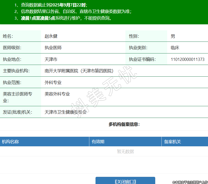 姓名:趙永健性別:男醫(yī)師級(jí)別:執(zhí)業(yè)醫(yī)師執(zhí)業(yè)類別:臨床執(zhí)業(yè)地點(diǎn):天津市執(zhí)業(yè)證書編碼:110120000011373主要執(zhí)業(yè)機(jī)構(gòu):南開(kāi)大學(xué)附屬醫(yī)院(天津市第四醫(yī)院)執(zhí)業(yè)范圍:外科專業(yè)美容主診醫(yī)師專業(yè):美容外科專業(yè)發(fā)證(批準(zhǔn))機(jī)關(guān):天津市衛(wèi)生健康委員會(huì) -