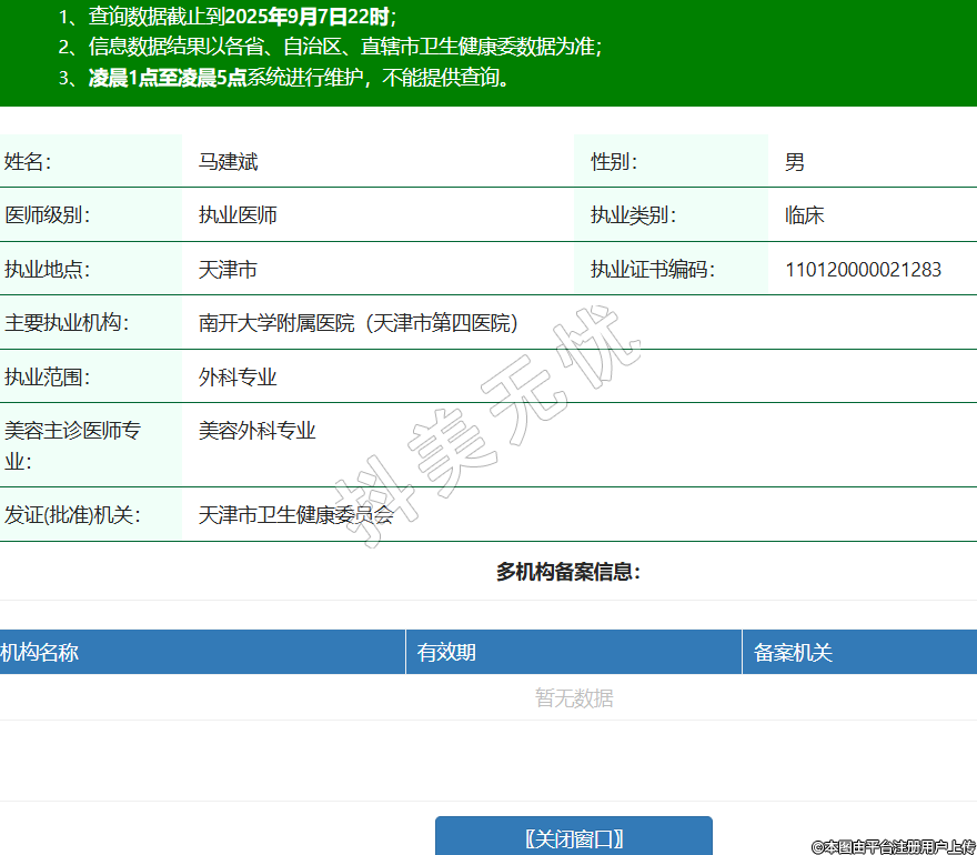 姓名:馬建斌性別:男醫(yī)師級別:執(zhí)業(yè)醫(yī)師執(zhí)業(yè)類別:臨床執(zhí)業(yè)地點(diǎn):天津市執(zhí)業(yè)證書編碼:110120000021283主要執(zhí)業(yè)機(jī)構(gòu):南開大學(xué)附屬醫(yī)院(天津市第四醫(yī)院)執(zhí)業(yè)范圍:外科專業(yè)美容主診醫(yī)師專業(yè):美容外科專業(yè)發(fā)證(批準(zhǔn))機(jī)關(guān):天津市衛(wèi)生健康委員會