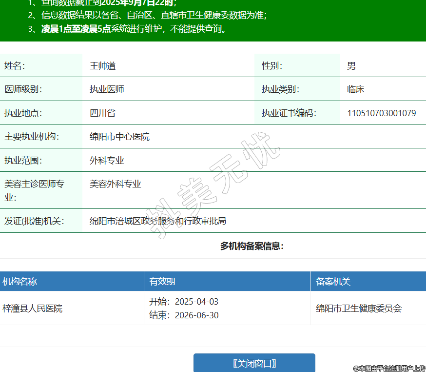 姓名:王帥道性別:男醫(yī)師級別:執(zhí)業(yè)醫(yī)師執(zhí)業(yè)類別:臨床執(zhí)業(yè)地點(diǎn):四川省執(zhí)業(yè)證書編碼:110510703001079主要執(zhí)業(yè)機(jī)構(gòu):綿陽市中心醫(yī)院執(zhí)業(yè)范圍:外科專業(yè)美容主診醫(yī)師專業(yè):美容外科專業(yè)發(fā)證(批準(zhǔn))機(jī)關(guān):綿陽市涪城區(qū)政務(wù)服務(wù)和行政審批局多機(jī)構(gòu)備案信息:機(jī)構(gòu)名稱 有效期 備案機(jī)關(guān) 梓潼縣人民醫(yī)院 開始:2025-04-03結(jié)束:2026-06-30綿陽市衛(wèi)生健康委員會 -