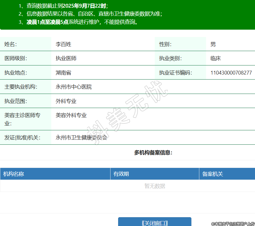 姓名:李百姓性別:男醫(yī)師級別:執(zhí)業(yè)醫(yī)師執(zhí)業(yè)類別:臨床執(zhí)業(yè)地點(diǎn):湖南省執(zhí)業(yè)證書編碼:110430000708277主要執(zhí)業(yè)機(jī)構(gòu):永州市中心醫(yī)院執(zhí)業(yè)范圍:外科專業(yè)美容主診醫(yī)師專業(yè):美容外科專業(yè)發(fā)證(批準(zhǔn))機(jī)關(guān):永州市衛(wèi)生健康委員會 -