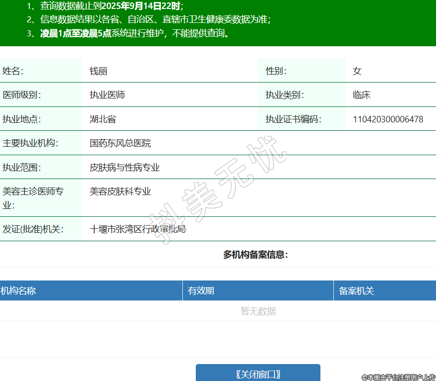 姓名:錢麗性別:女醫(yī)師級別:執(zhí)業(yè)醫(yī)師執(zhí)業(yè)類別:臨床執(zhí)業(yè)地點:湖北省執(zhí)業(yè)證書編碼:110420300006478主要執(zhí)業(yè)機構(gòu):國藥東風總醫(yī)院執(zhí)業(yè)范圍:皮膚病與性病專業(yè)美容主診醫(yī)師專業(yè):美容皮膚科專業(yè)發(fā)證(批準)機關:十堰市張灣區(qū)行政審批局 -
