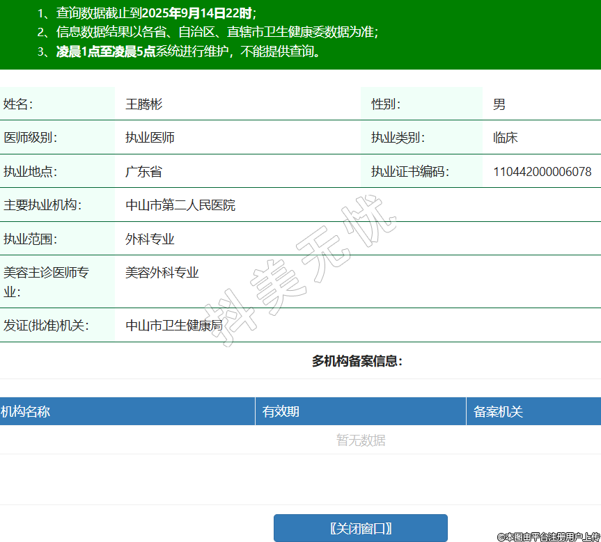 姓名:王騰彬性別:男醫(yī)師級別:執(zhí)業(yè)醫(yī)師執(zhí)業(yè)類別:臨床執(zhí)業(yè)地點:廣東省執(zhí)業(yè)證書編碼:110442000006078主要執(zhí)業(yè)機構(gòu):中山市第二人民醫(yī)院執(zhí)業(yè)范圍:外科專業(yè)美容主診醫(yī)師專業(yè):美容外科專業(yè)發(fā)證(批準(zhǔn))機關(guān):中山市衛(wèi)生健康局 -