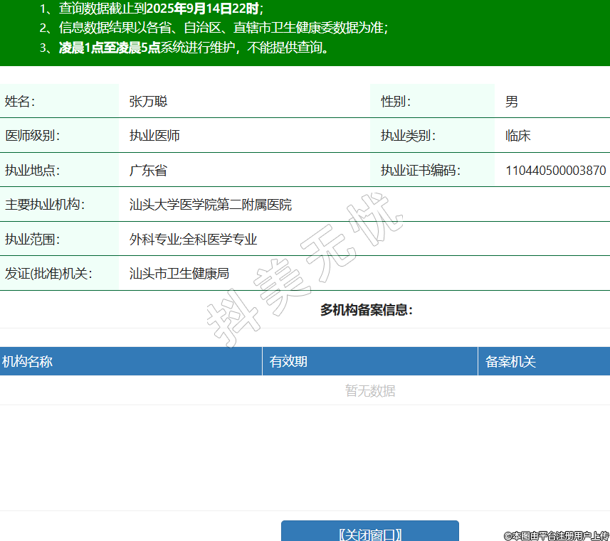 姓名:張萬聰性別:男醫(yī)師級別:執(zhí)業(yè)醫(yī)師執(zhí)業(yè)類別:臨床執(zhí)業(yè)地點:廣東省執(zhí)業(yè)證書編碼:110440500003870主要執(zhí)業(yè)機構(gòu):汕頭大學醫(yī)學院第二附屬醫(yī)院執(zhí)業(yè)范圍:外科專業(yè);全科醫(yī)學專業(yè)發(fā)證(批準)機關:汕頭市衛(wèi)生健康局
