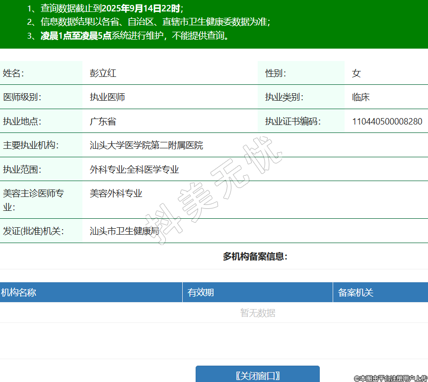姓名:彭立紅性別:女醫(yī)師級(jí)別:執(zhí)業(yè)醫(yī)師執(zhí)業(yè)類別:臨床執(zhí)業(yè)地點(diǎn):廣東省執(zhí)業(yè)證書編碼:110440500008280主要執(zhí)業(yè)機(jī)構(gòu):汕頭大學(xué)醫(yī)學(xué)院第二附屬醫(yī)院執(zhí)業(yè)范圍:外科專業(yè);全科醫(yī)學(xué)專業(yè)美容主診醫(yī)師專業(yè):美容外科專業(yè)發(fā)證(批準(zhǔn))機(jī)關(guān):汕頭市衛(wèi)生健康局