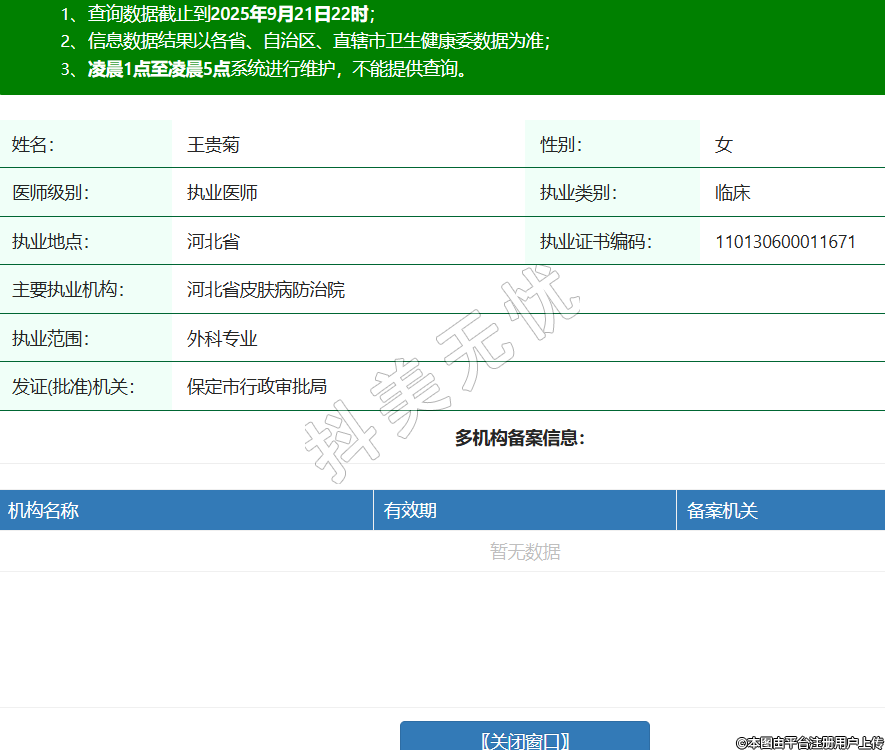 姓名:王貴菊性別:女醫(yī)師級別:執(zhí)業(yè)醫(yī)師執(zhí)業(yè)類別:臨床執(zhí)業(yè)地點:河北省執(zhí)業(yè)證書編碼:110130600011671主要執(zhí)業(yè)機構(gòu):河北省皮膚病防治院執(zhí)業(yè)范圍:外科專業(yè)發(fā)證(批準)機關(guān):保定市行政審批局 -