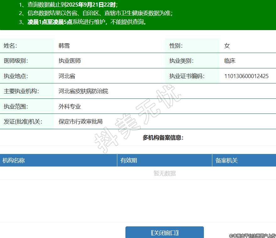 姓名:韓雪性別:女醫(yī)師級(jí)別:執(zhí)業(yè)醫(yī)師執(zhí)業(yè)類(lèi)別:臨床執(zhí)業(yè)地點(diǎn):河北省執(zhí)業(yè)證書(shū)編碼:110130600012425主要執(zhí)業(yè)機(jī)構(gòu):河北省皮膚病防治院執(zhí)業(yè)范圍:外科專(zhuān)業(yè)發(fā)證(批準(zhǔn))機(jī)關(guān):保定市行政審批局 -