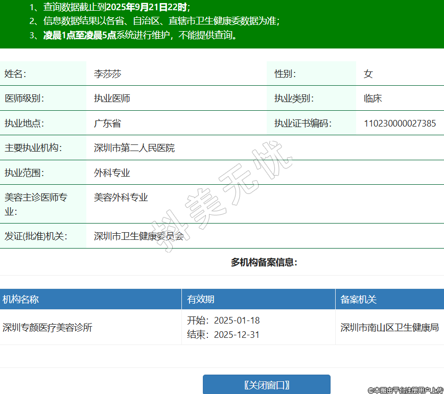 姓名:李莎莎性別:女醫(yī)師級(jí)別:執(zhí)業(yè)醫(yī)師執(zhí)業(yè)類別:臨床執(zhí)業(yè)地點(diǎn):廣東省執(zhí)業(yè)證書編碼:110230000027385主要執(zhí)業(yè)機(jī)構(gòu):深圳市第二人民醫(yī)院執(zhí)業(yè)范圍:外科專業(yè)美容主診醫(yī)師專業(yè):美容外科專業(yè)發(fā)證(批準(zhǔn))機(jī)關(guān):深圳市衛(wèi)生健康委員會(huì)多機(jī)構(gòu)備案信息:機(jī)構(gòu)名稱 有效期 備案機(jī)關(guān) 深圳專顏醫(yī)療美容診所 開始:2025-01-18結(jié)束:2025-12-31深圳市南山區(qū)衛(wèi)生健康局 -