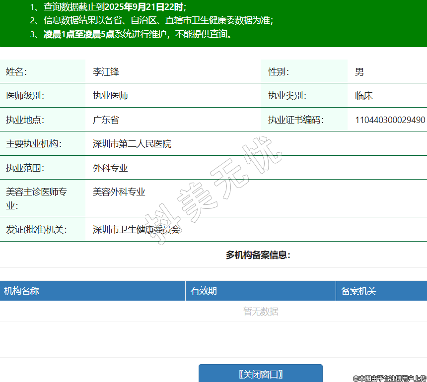姓名:李江鋒性別:男醫(yī)師級別:執(zhí)業(yè)醫(yī)師執(zhí)業(yè)類別:臨床執(zhí)業(yè)地點:廣東省執(zhí)業(yè)證書編碼:110440300029490主要執(zhí)業(yè)機構(gòu):深圳市第二人民醫(yī)院執(zhí)業(yè)范圍:外科專業(yè)美容主診醫(yī)師專業(yè):美容外科專業(yè)發(fā)證(批準(zhǔn))機關(guān):深圳市衛(wèi)生健康委員會 -