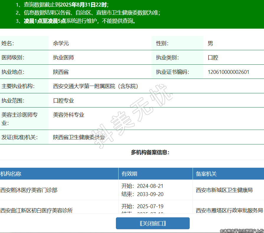 姓名:余學(xué)元性別:男醫(yī)師級(jí)別:執(zhí)業(yè)醫(yī)師執(zhí)業(yè)類別:口腔執(zhí)業(yè)地點(diǎn):陜西省執(zhí)業(yè)證書編碼:120610000002601主要執(zhí)業(yè)機(jī)構(gòu):西安交通大學(xué)第一附屬醫(yī)院(含東院)執(zhí)業(yè)范圍:口腔專業(yè)美容主診醫(yī)師專業(yè):美容外科專業(yè)發(fā)證(批準(zhǔn))機(jī)關(guān):陜西省衛(wèi)生健康委員會(huì)多機(jī)構(gòu)備案信息:機(jī)構(gòu)名稱 有效期 備案機(jī)關(guān) 西安熙沐醫(yī)療美容門診部 開始:2024-08-21結(jié)束:2033-09-20西安市新城區(qū)衛(wèi)生健康局 西安曲江新區(qū)初白醫(yī)療美容診所 開始:2025-07-19結(jié)束:2035-07-18西安市雁塔區(qū)行政審批服務(wù)局 -