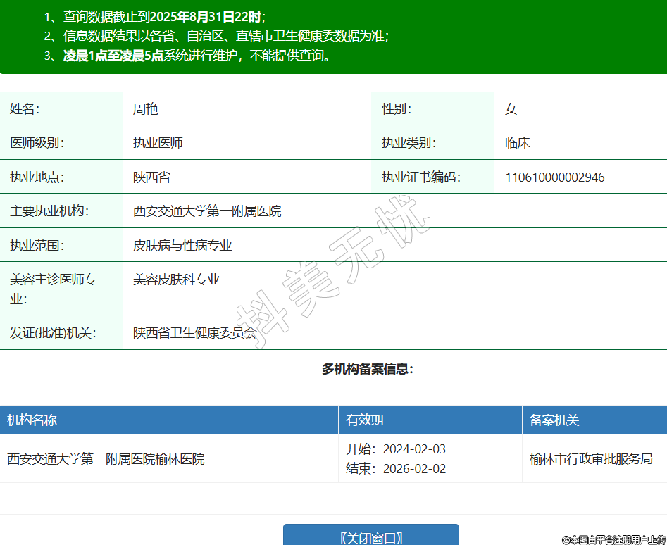 姓名:周艷性別:女醫(yī)師級別:執(zhí)業(yè)醫(yī)師執(zhí)業(yè)類別:臨床執(zhí)業(yè)地點(diǎn):陜西省執(zhí)業(yè)證書編碼:110610000002946主要執(zhí)業(yè)機(jī)構(gòu):西安交通大學(xué)第一附屬醫(yī)院執(zhí)業(yè)范圍:皮膚病與性病專業(yè)美容主診醫(yī)師專業(yè):美容皮膚科專業(yè)發(fā)證(批準(zhǔn))機(jī)關(guān):陜西省衛(wèi)生健康委員會多機(jī)構(gòu)備案信息:機(jī)構(gòu)名稱 有效期 備案機(jī)關(guān) 西安交通大學(xué)第一附屬醫(yī)院榆林醫(yī)院 開始:2024-02-03結(jié)束:2026-02-02榆林市行政審批服務(wù)局 -