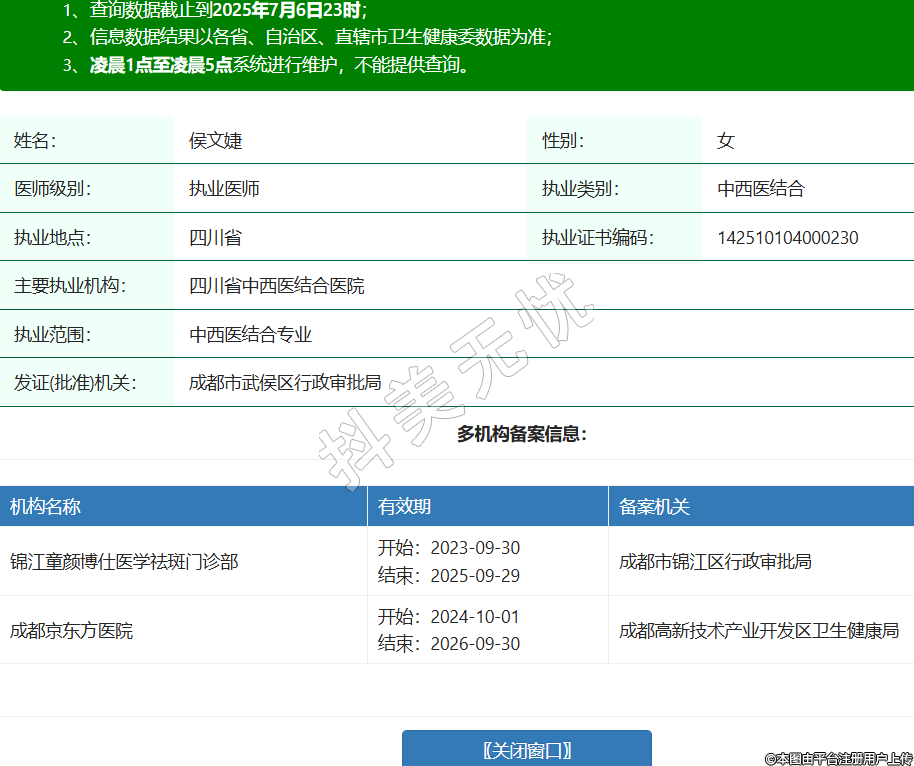 機(jī)構(gòu)名稱 有效期 備案機(jī)關(guān) 錦江童顏博仕醫(yī)學(xué)祛斑門診部 開始:2023-09-30結(jié)束:2025-09-29成都市錦江區(qū)行政審批局 成都京東方醫(yī)院 開始:2024-10-01結(jié)束:2026-09-30成都高新技術(shù)產(chǎn)業(yè)開發(fā)區(qū)衛(wèi)生健康局 -