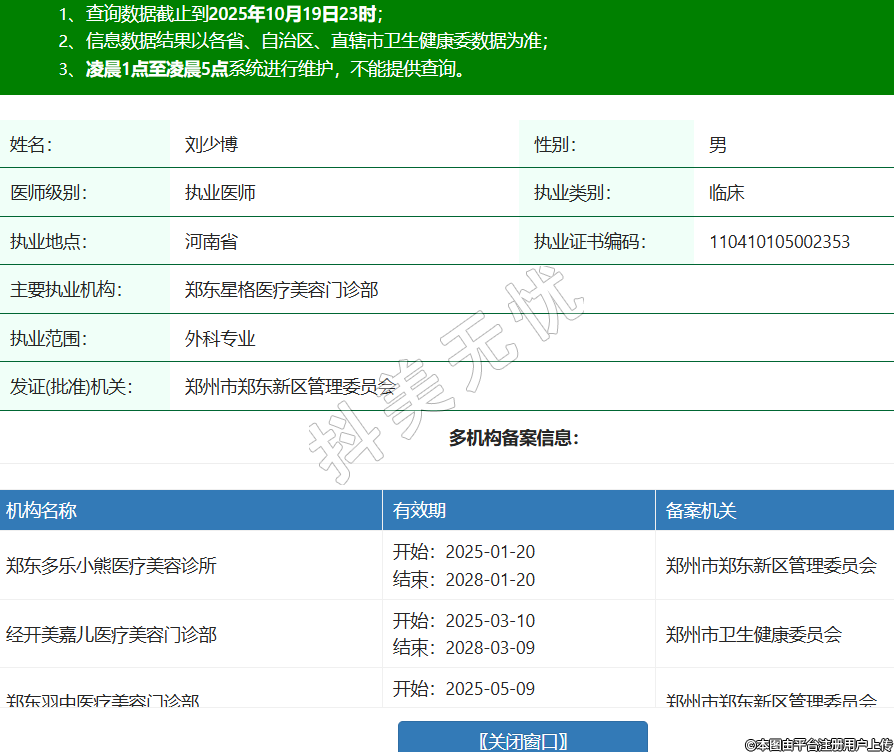 姓名:劉少博性別:男醫(yī)師級(jí)別:執(zhí)業(yè)醫(yī)師執(zhí)業(yè)類別:臨床執(zhí)業(yè)地點(diǎn):河南省執(zhí)業(yè)證書編碼:110410105002353主要執(zhí)業(yè)機(jī)構(gòu):鄭東星格醫(yī)療美容門診部執(zhí)業(yè)范圍:外科專業(yè)發(fā)證(批準(zhǔn))機(jī)關(guān):鄭州市鄭東新區(qū)管理委員會(huì)多機(jī)構(gòu)備案信息:機(jī)構(gòu)名稱 有效期 備案機(jī)關(guān) 鄭東多樂小熊醫(yī)療美容診所 開始:2025-01-20結(jié)束:2028-01-20鄭州市鄭東新區(qū)管理委員會(huì) 經(jīng)開美嘉兒醫(yī)療美容門診部 開始:2025-03-10結(jié)束:2028-03-09鄭州市衛(wèi)生健康委員會(huì) 鄭東羽中醫(yī)療美容門診部 開始:2025-05-09結(jié)束:2028-05-08鄭州市鄭東新區(qū)管理委員會(huì) -