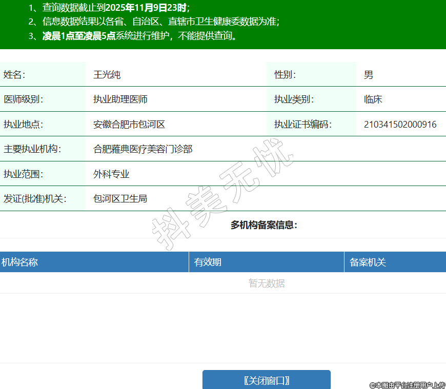 姓名:王光純性別:男醫(yī)師級(jí)別:執(zhí)業(yè)助理醫(yī)師執(zhí)業(yè)類別:臨床執(zhí)業(yè)地點(diǎn):安徽合肥市包河區(qū)執(zhí)業(yè)證書編碼:210341502000916主要執(zhí)業(yè)機(jī)構(gòu):合肥蕥典醫(yī)療美容門診部執(zhí)業(yè)范圍:外科專業(yè)發(fā)證(批準(zhǔn))機(jī)關(guān):包河區(qū)衛(wèi)生局 -