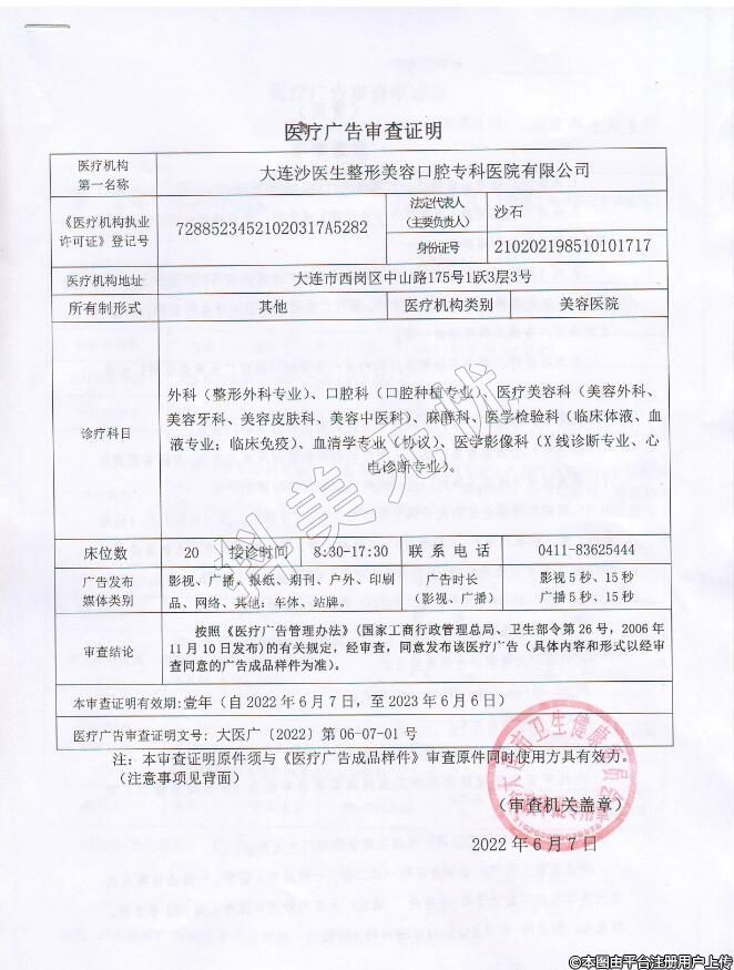醫(yī)療機(jī)構(gòu)名稱:大連沙醫(yī)生整形美容口腔專(zhuān)科醫(yī)院