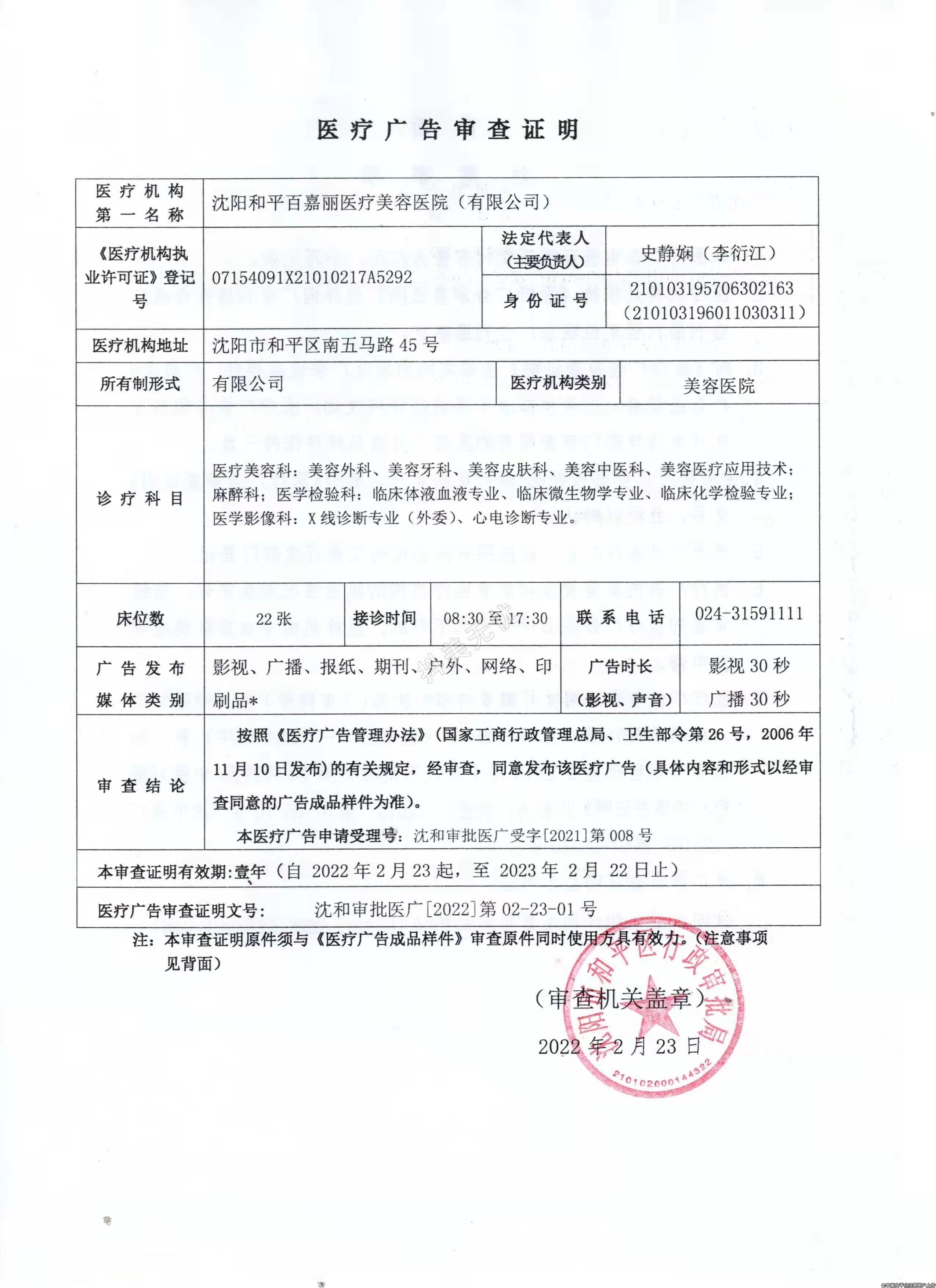 診療科目:醫(yī)療美容科(門診、住院、病床22張、牙椅2張);美容外科;美容牙科(牙椅2臺);美容皮膚科;美容中醫(yī)科;美容醫(yī)療應用技術/麻醉科/醫(yī)學檢驗科、臨床體液、血液專業(yè);臨床微生物學專業(yè);臨床化學檢驗專業(yè)/醫(yī)學影像科、X線診斷專業(yè)(外委);心電診斷專業(yè)******