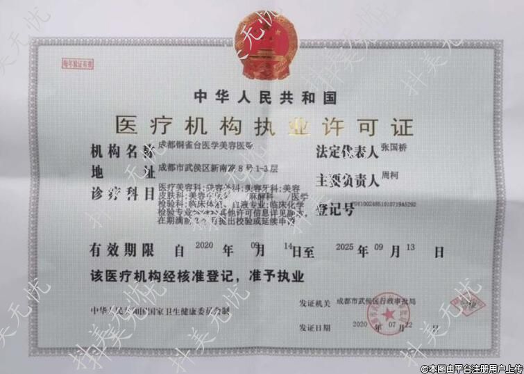 診療科目:醫(yī)療美容科;美容外科;美容牙科;美容皮膚科;美容中醫(yī)科/麻醉科/醫(yī)學檢驗科;臨床體液、血液專業(yè);臨床化學檢驗專業(yè)******其他許可信息詳見副本,在期滿前3個月提出校驗或延續(xù)申請