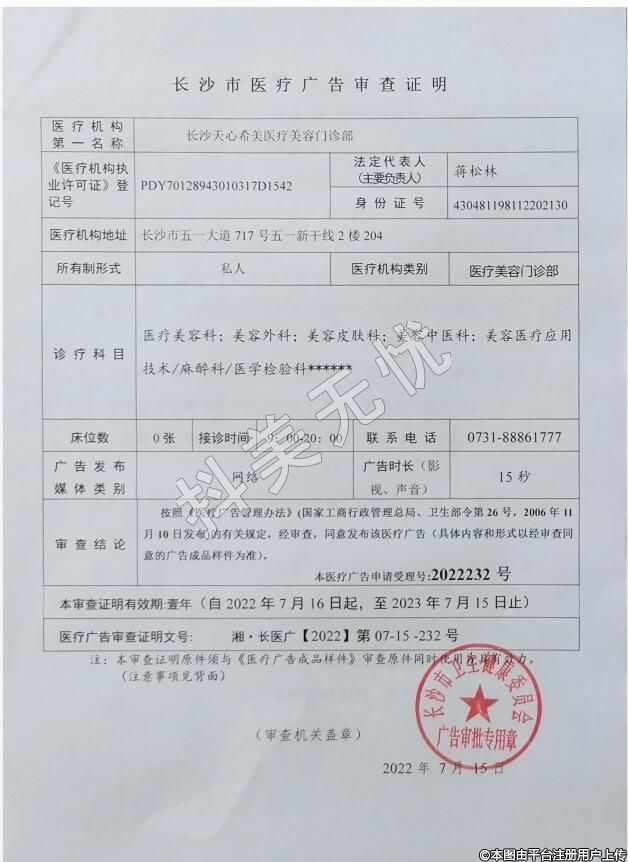 診療科目:醫(yī)療美容科;美容外科;美容皮膚科;美容中醫(yī)科;美容醫(yī)療應(yīng)用技術(shù)/麻醉科/醫(yī)學(xué)檢驗(yàn)科法定代表人:蔣松林