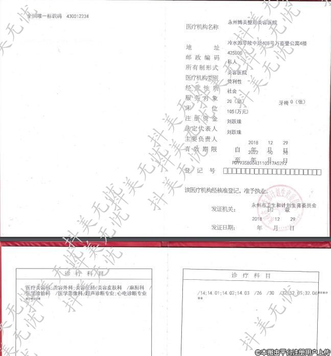 診療科目:美容外科;美容牙科;美容皮膚科/麻醉科/醫(yī)學檢驗科/醫(yī)學影像科;超聲診斷專業(yè);心電診斷專業(yè)******/14;14.01;14.02;14.03/26/30/32;32.05;32.06******