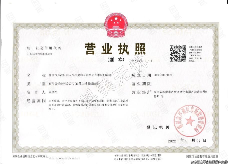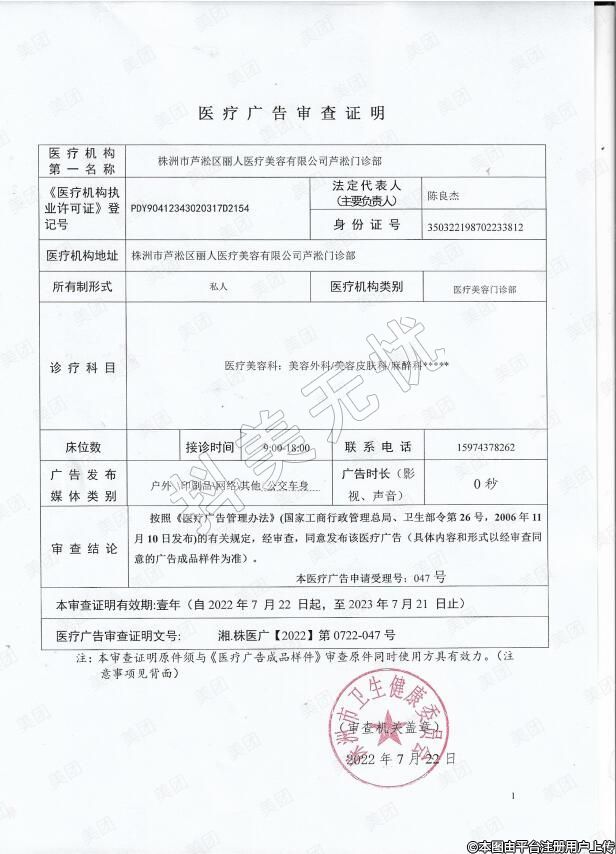 機(jī)構(gòu)名稱:株洲市蘆淞區(qū)麗人醫(yī)療美容有限公司蘆淞門診部