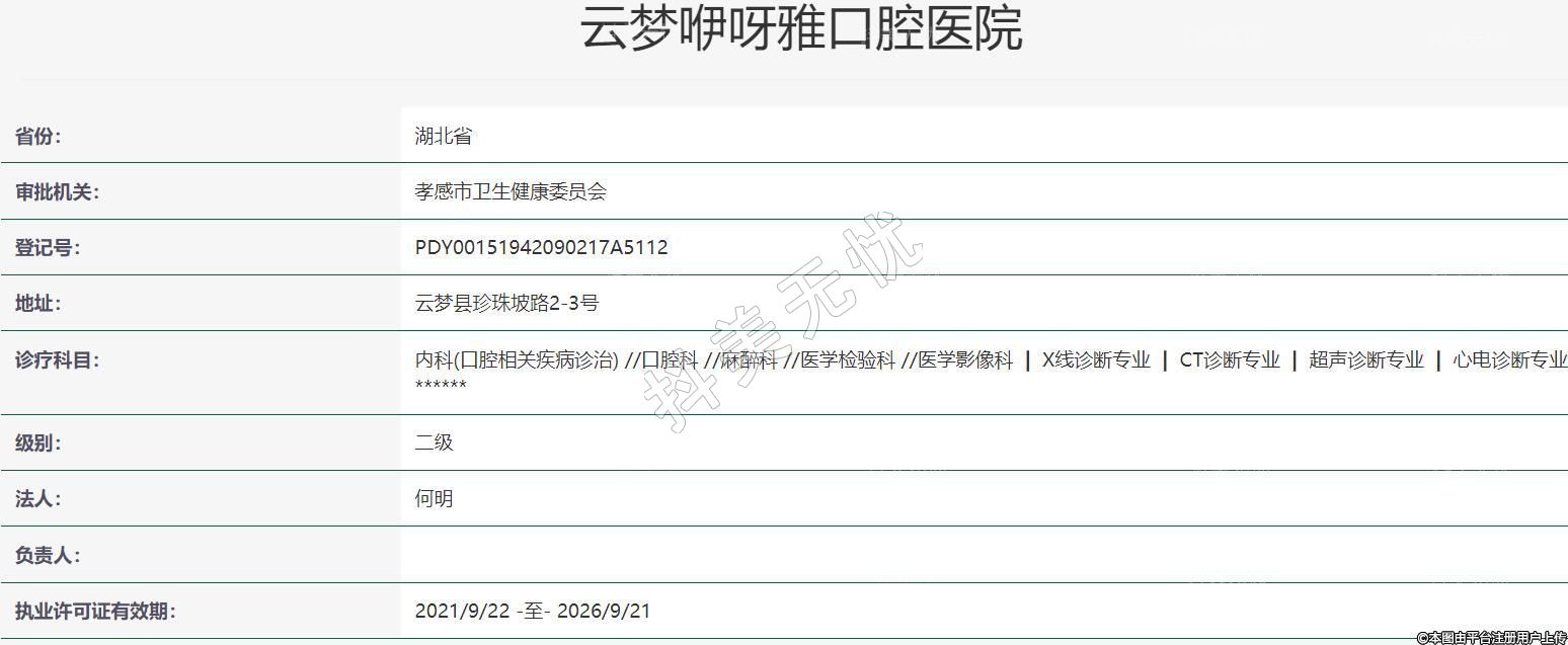 云夢咿呀雅口腔2016年02月26日成立。診療科目:內(nèi)科(口腔相關(guān)疾病診治) //口腔科 //麻醉科 //醫(yī)學(xué)檢驗科 //醫(yī)學(xué)影像科 | X線診斷專業(yè) | CT診斷專業(yè) | 超聲診斷專業(yè) | 心電診斷專業(yè)******
