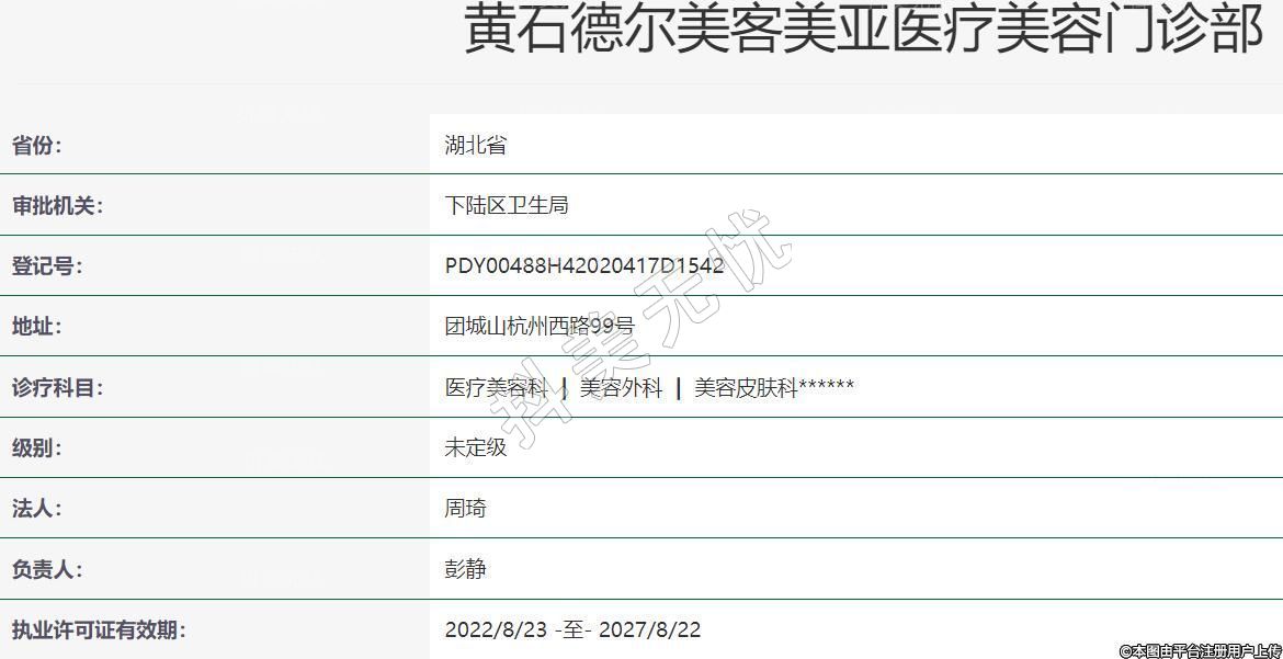 黃石德爾美客美亞醫(yī)療美容成立于2013-12-27,地址:團城山杭州西路99號,診療科目:醫(yī)療美容科 | 美容外科 | 美容皮膚科******