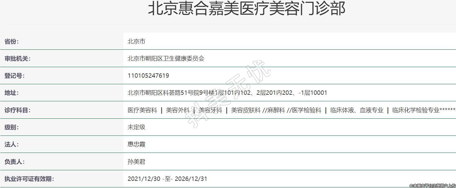 北京惠合嘉美醫(yī)療美容2016-07-28成立,診療科目:醫(yī)療美容科 | 美容外科 | 美容牙科 | 美容皮膚科 //麻醉科 //醫(yī)學檢驗科 | 臨床體液、血液專業(yè) | 臨床化學檢驗專業(yè)******