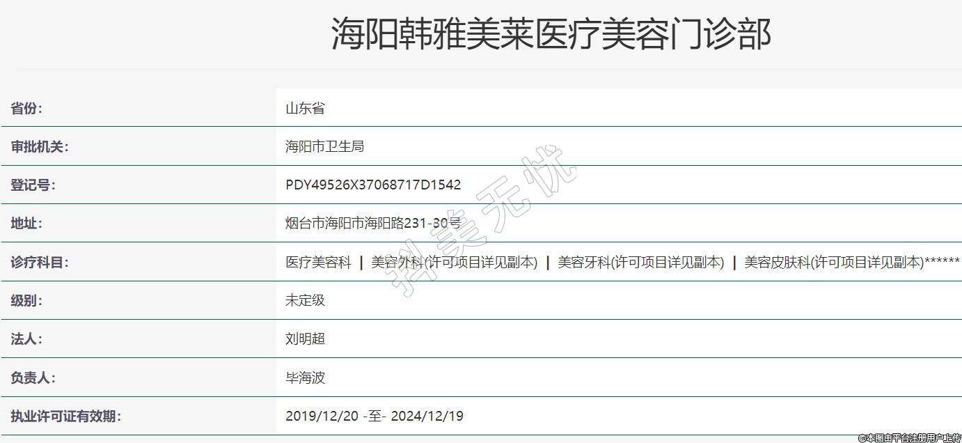 煙臺韓雅美萊醫(yī)療美容2019-04-22成立,地址:煙臺市海陽市海陽路231-30號,診療科目:醫(yī)療美容科 | 美容外科(許可項目詳見副本) | 美容牙科(許可項目詳見副本) | 美容皮膚科(許可項目詳見副本)******