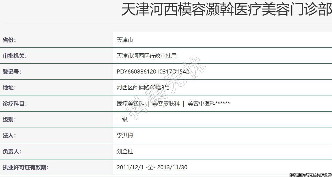 天津模容灝斡醫(yī)療美容2012年1月18日成立,地址:河西區(qū)閩侯路60增3號,診療科目:醫(yī)療美容科 | 美容皮膚科 | 美容中醫(yī)科******