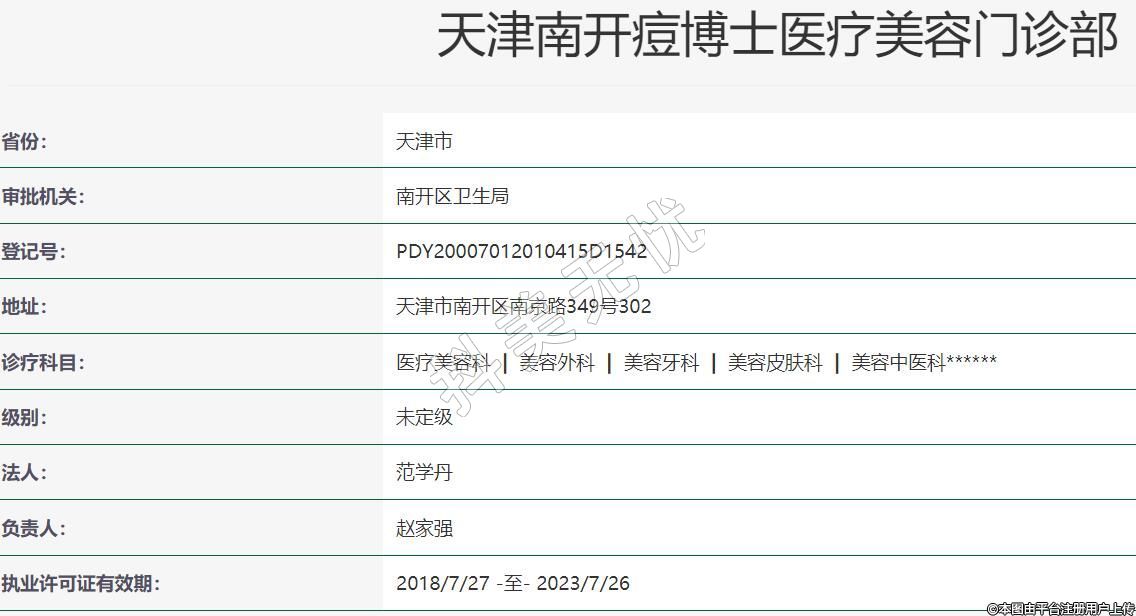天津痘博士醫(yī)療美容2016年01月14日成立,地址:天津市南開區(qū)南京路349號302,診療科目:醫(yī)療美容科 | 美容外科 | 美容牙科 | 美容皮膚科 | 美容中醫(yī)科******