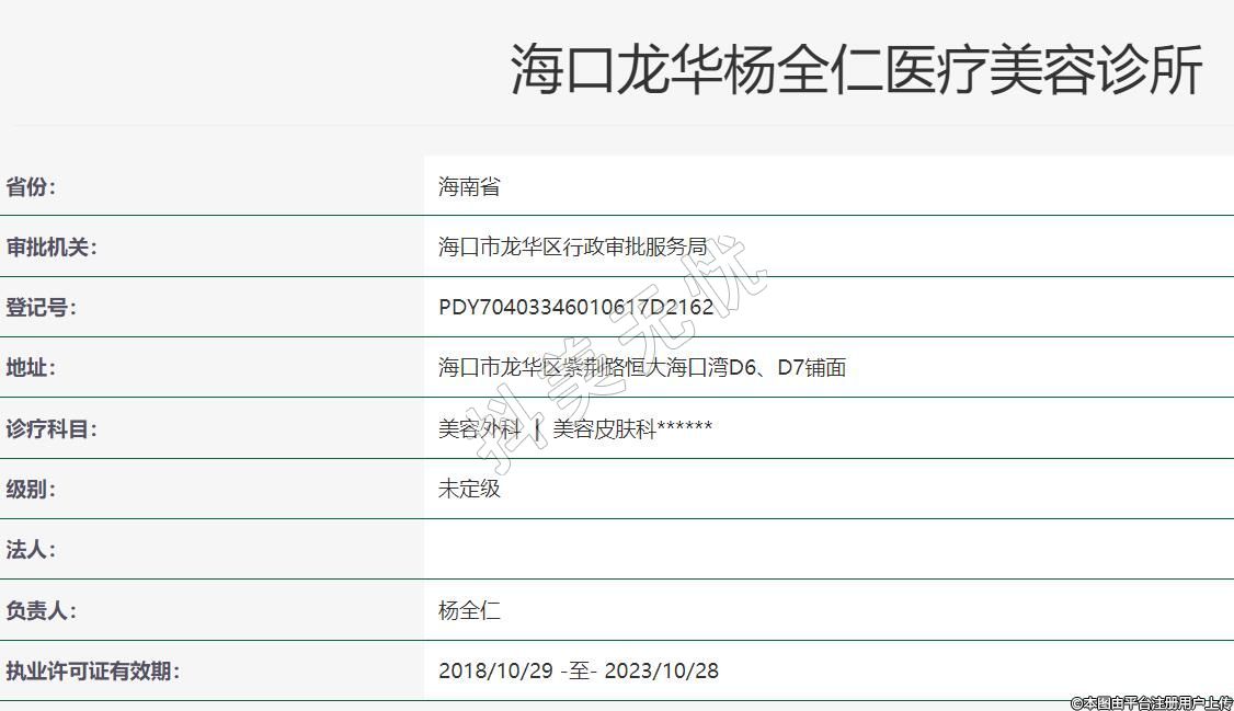 ??邶埲A楊全仁醫(yī)療美容診所成立于2018年11月12日,注冊地位于??谑旋埲A區(qū)海棠路3號恒大??跒扯谀蠀^(qū)商業(yè)3層D06、D07房,法定代表人為楊全仁。經營范圍包括醫(yī)療美容服務