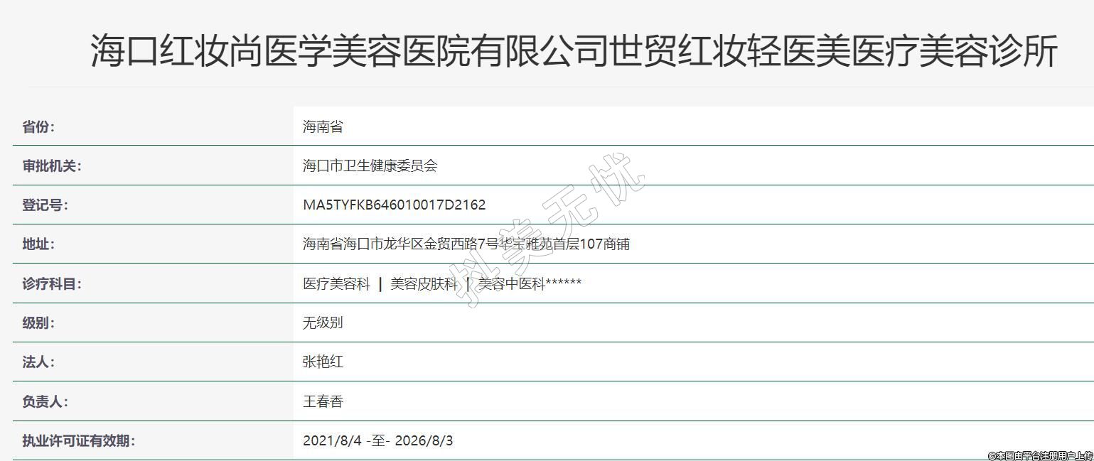 海口紅妝尚醫(yī)學(xué)美容醫(yī)院有限公司世貿(mào)紅妝輕醫(yī)美醫(yī)療美容診所成立于2021年04月23日,注冊地位于海南省??谑旋埲A區(qū)金貿(mào)西路7號華寶雅苑首層107號商鋪,法定代表人為張艷紅。經(jīng)營范圍包括美容服務(wù);醫(yī)療美容科:美容外科、美容皮膚科、美容牙科、美容中醫(yī)科;麻醉科;醫(yī)學(xué)檢驗(yàn)科:臨床體液、血液專業(yè);醫(yī)學(xué)影像學(xué):心電診斷專業(yè)******