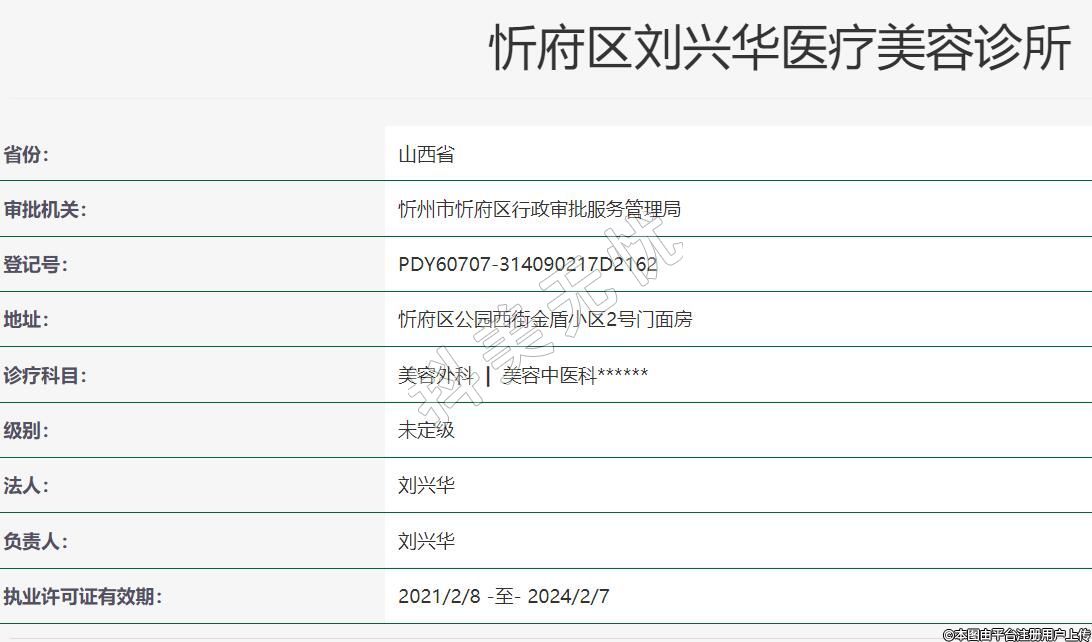 沂州劉興華醫(yī)療美容2021年04月25日成立,地址:忻府區(qū)公園西街金盾小區(qū)2號門面房,診療科目:美容外科 | 美容中醫(yī)科******