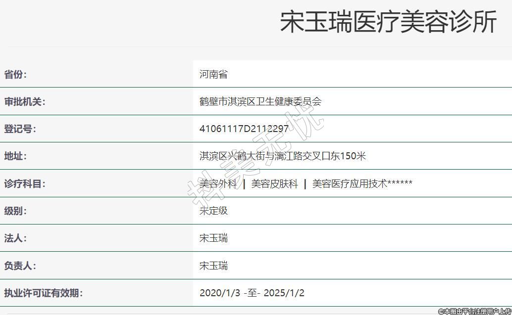 鶴壁宋玉瑞醫(yī)療美容2021年10月28日成立,地址:淇濱區(qū)興鶴大街與漓江路交叉口東150米,診療科目:美容外科 | 美容皮膚科 | 美容醫(yī)療應(yīng)用技術(shù)******