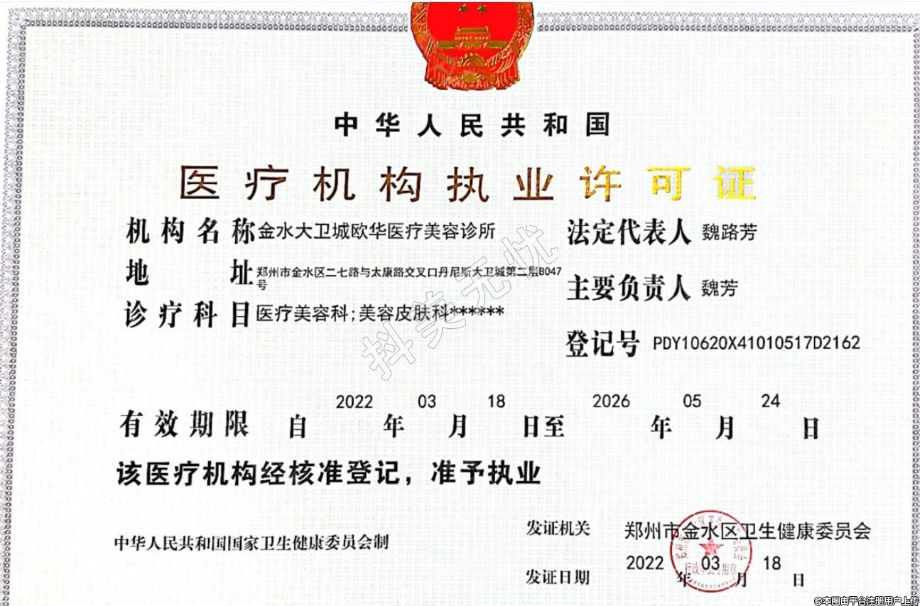 鄭州歐華醫(yī)療美容(大衛(wèi)城)2017-11-02成立,地址:鄭州市金水區(qū)二七路與太康路交叉口丹尼斯大衛(wèi)城第二層0047號,診療科目:醫(yī)療美容科 | 美容外科 | 美容皮膚科******