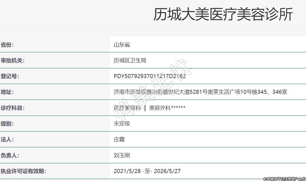 濟南大美醫(yī)療美容2020-12-25成立,地址:濟南市歷城區(qū)唐冶街道世紀大道5281號奧萊生活廣場10號樓345、346室,診療科目:醫(yī)療美容科 | 美容外科******