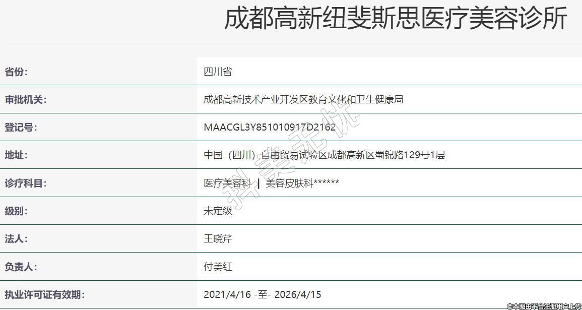 成都紐斐斯思醫(yī)療美容2021年03月22日成立,地址:中國(四川)自由貿(mào)易試驗(yàn)區(qū)成都高新區(qū)蜀錦路129號1層,診療科目:醫(yī)療美容科 | 美容皮膚科******