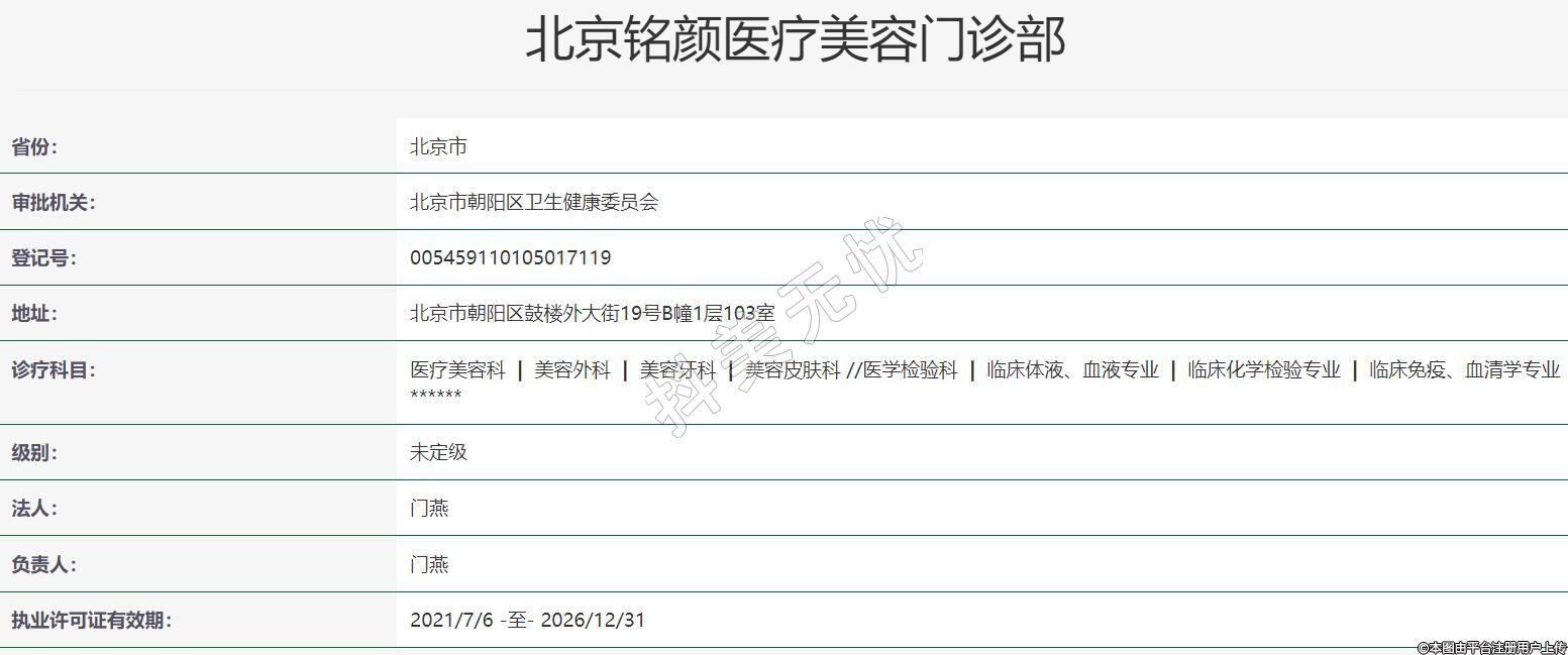 北京銘顏醫(yī)療美容2020-12-18成立,診療科目:醫(yī)療美容科 | 美容外科 | 美容牙科 | 美容皮膚科 //醫(yī)學檢驗科 | 臨床體液、血液專業(yè) | 臨床化學檢驗專業(yè) | 臨床免疫、血清學專業(yè)******
