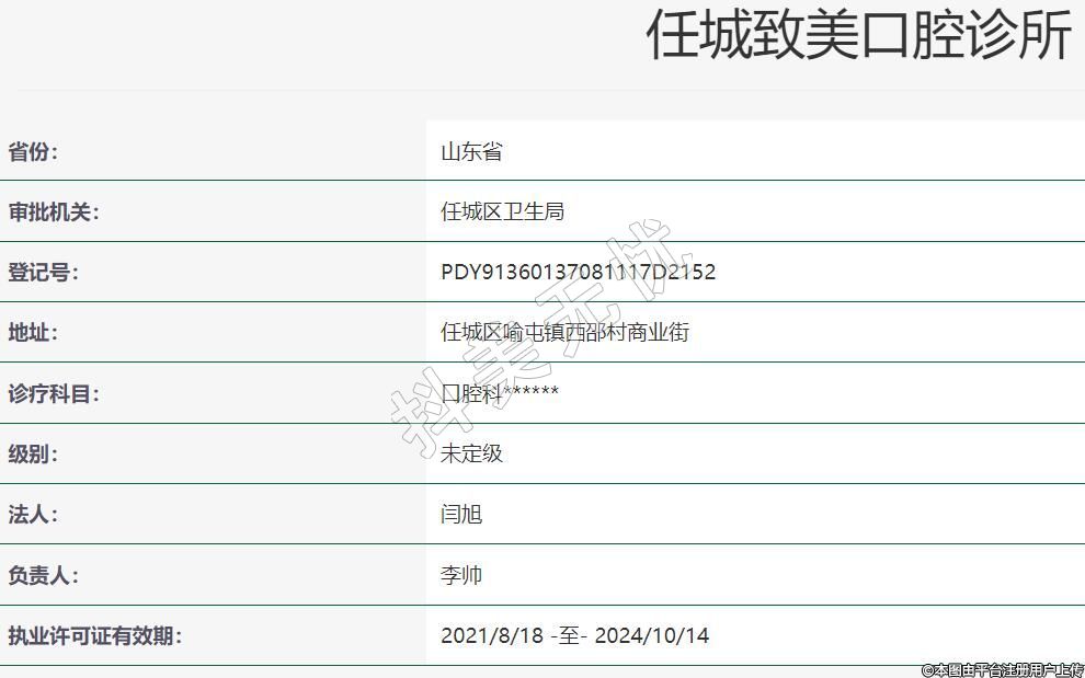 濟(jì)寧致美口腔2019-09-24成立,地址:任城區(qū)喻屯鎮(zhèn)西邵村商業(yè)街,診療科目:口腔科******