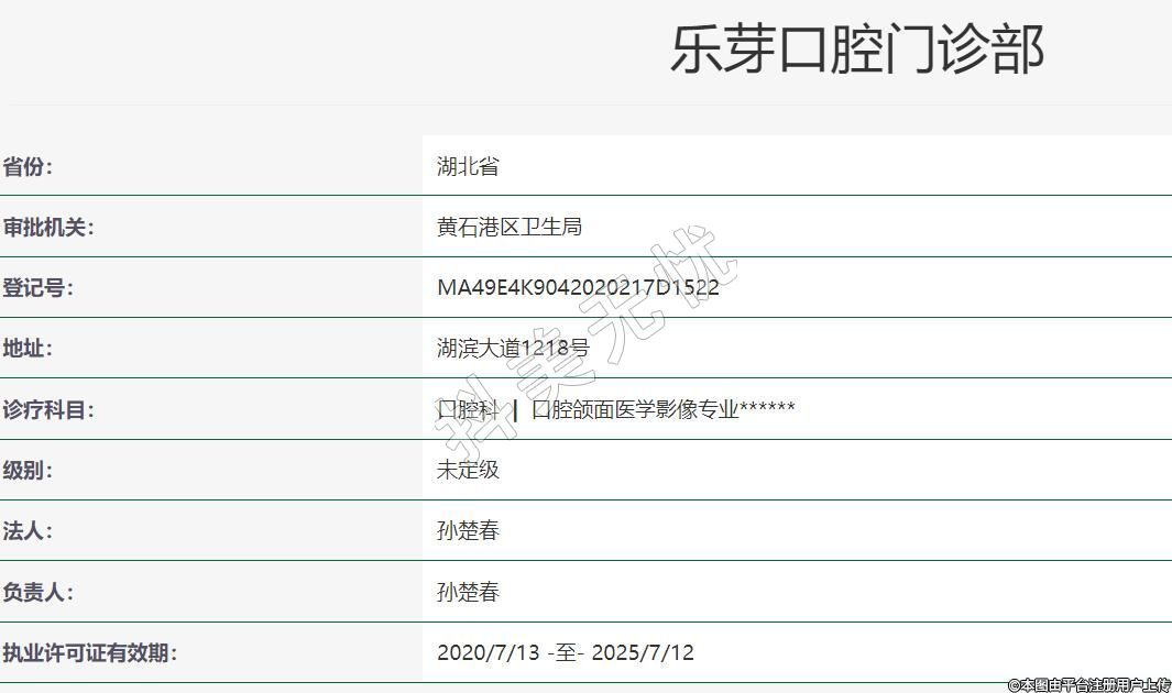 黃石樂芽口腔2019年12月31日成立,地址:湖濱大道1218號,診療科目:口腔科 | 口腔頜面醫(yī)學(xué)影像專業(yè)******