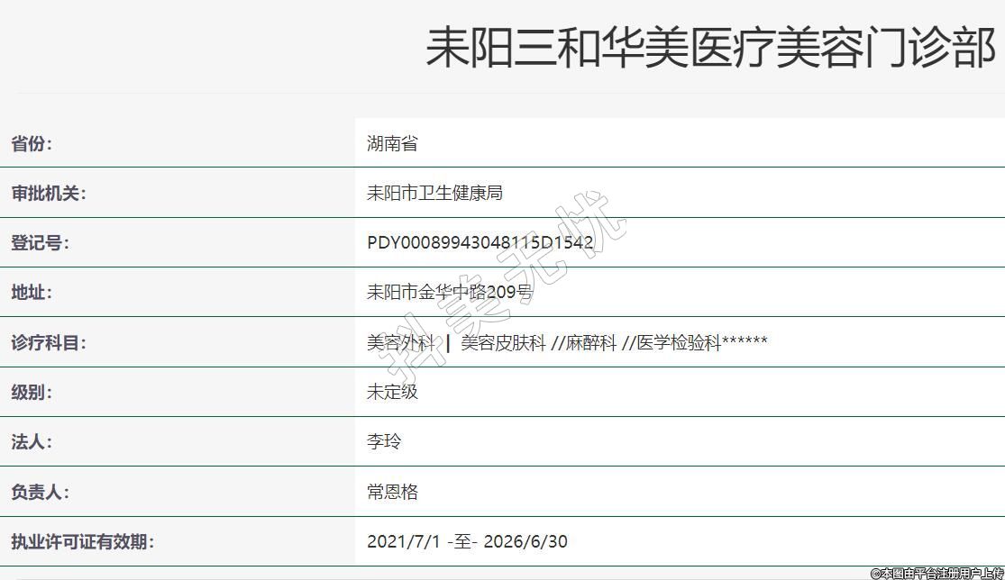 耒陽三和華美醫(yī)療美容2017年04月14日成立,地址:耒陽市金華中路209號,診療科目:美容外科 | 美容皮膚科 //麻醉科 //醫(yī)學檢驗科******
