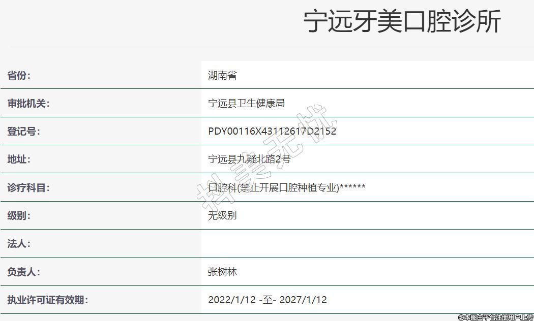 永州牙美口腔2022年01月20日成立,地址:寧遠縣九疑北路2號,診療科目:口腔科(禁止開展口腔種植專業(yè))******