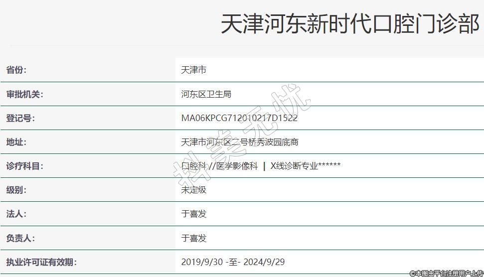 天津新時代口腔(秀波園)2019-03-29成立,地址:天津市河東區(qū)二號橋秀波園底商,診療科目:口腔科 //醫(yī)學影像科 | X線診斷專業(yè)******