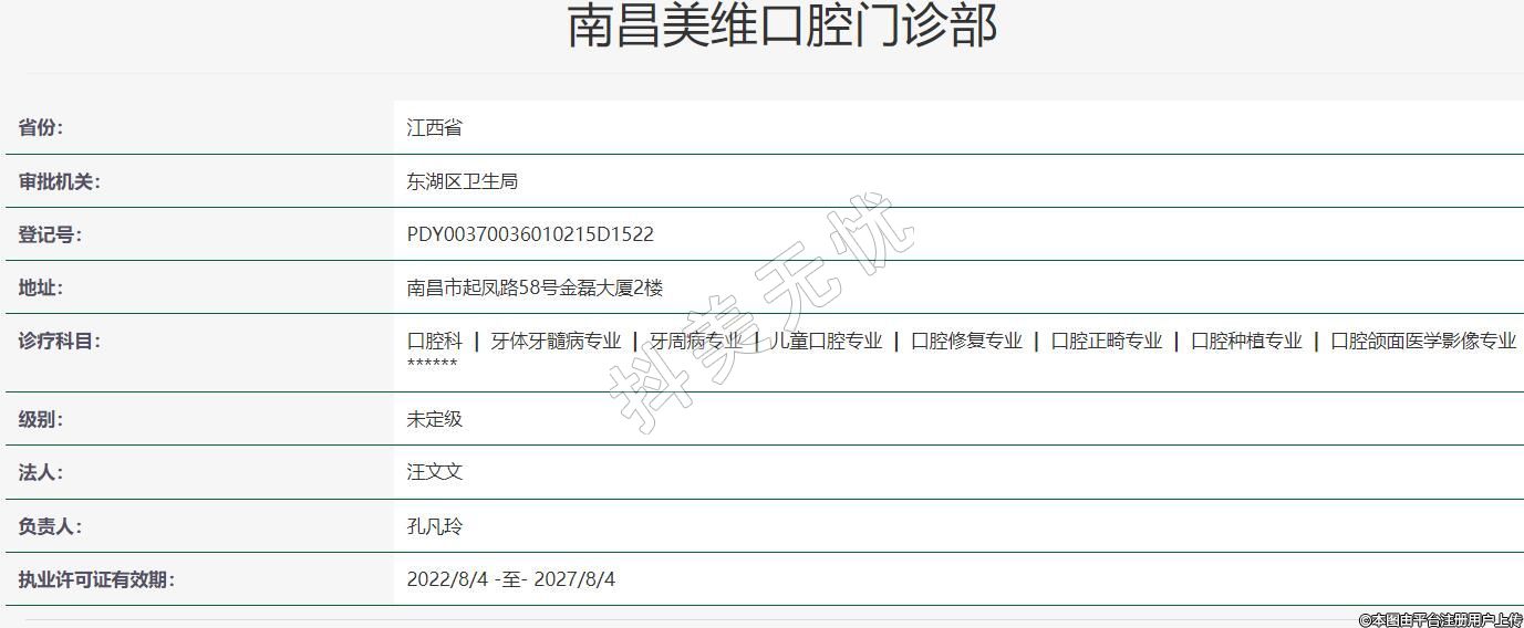 南昌美維口腔2017-05-16成立,診療科目:口腔科 | 牙體牙髓病專業(yè) | 牙周病專業(yè) | 兒童口腔專業(yè) | 口腔修復(fù)專業(yè) | 口腔正畸專業(yè) | 口腔種植專業(yè) | 口腔頜面醫(yī)學(xué)影像專業(yè)******