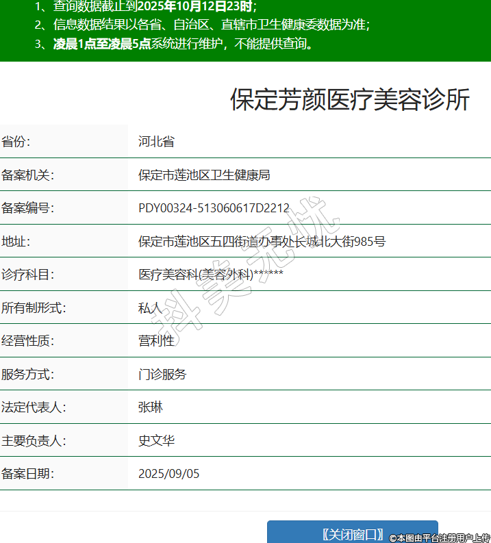 省份:河北省備案機關:保定市蓮池區(qū)衛(wèi)生健康局備案編號:PDY00324-513060617D2212地址:保定市蓮池區(qū)五四街道辦事處長城北大街985號診療科目:醫(yī)療美容科(美容外科)******所有制形式:私人經(jīng)營性質(zhì):營利性服務方式:門診服務法定代表人:張琳主要負責人:史文華備案日期:2025/09/05 -