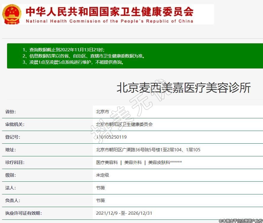 北京麥西美嘉醫(yī)療美容2016-11-14成立,地址:北京市朝陽區(qū)廣渠路36號院5號樓1至2層104、1層105,診療科目:醫(yī)療美容科 | 美容外科 | 美容皮膚科******