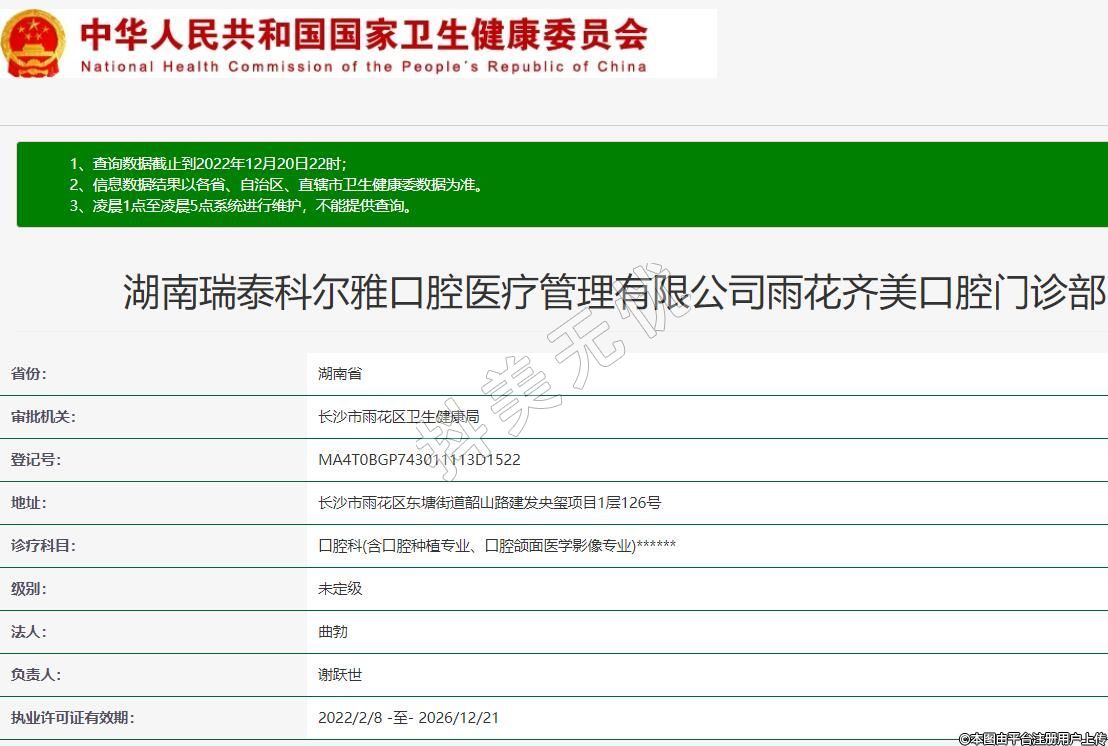 湖南瑞泰科爾雅口腔醫(yī)療管理有限公司雨花齊美口腔門診部